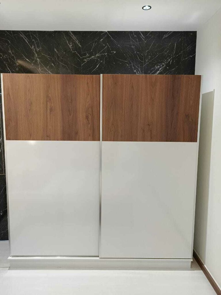 grandes surfaces blanc brillant et des panneaux supérieurs en bois