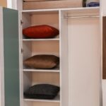 chaleureux qui semble flotter, soutenu par un bloc de rangement blanc