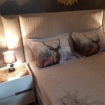 son lit doté d’une imposante tête de lit en velours beige. Le travail de