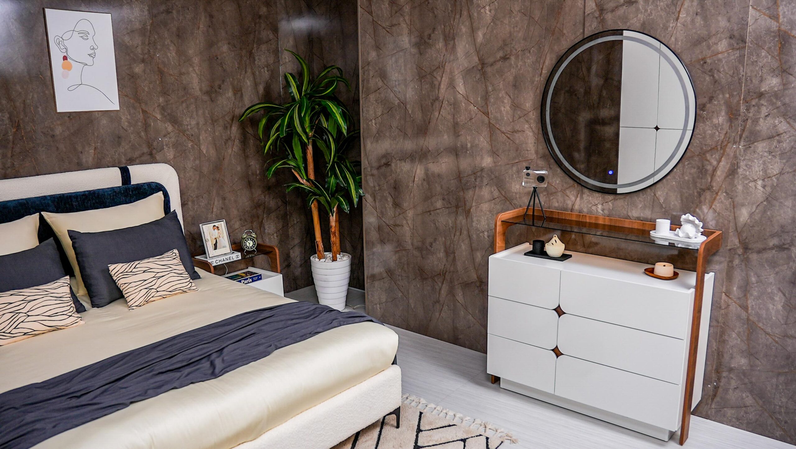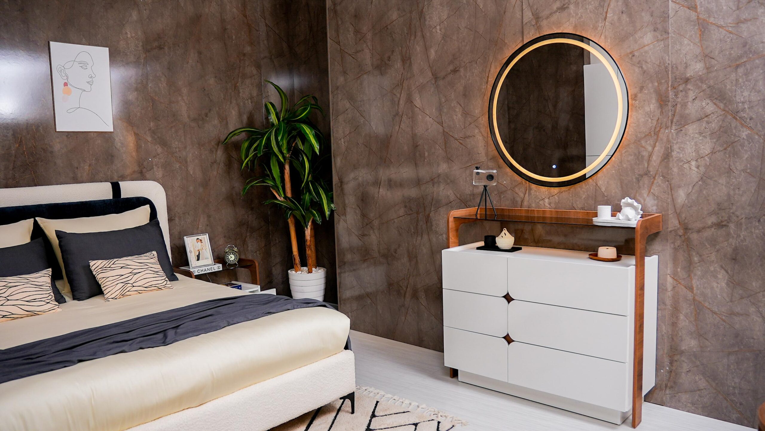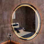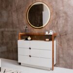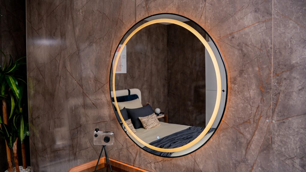 Un grand miroir rond minimaliste vient couronner cet espace, idéal pour