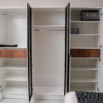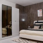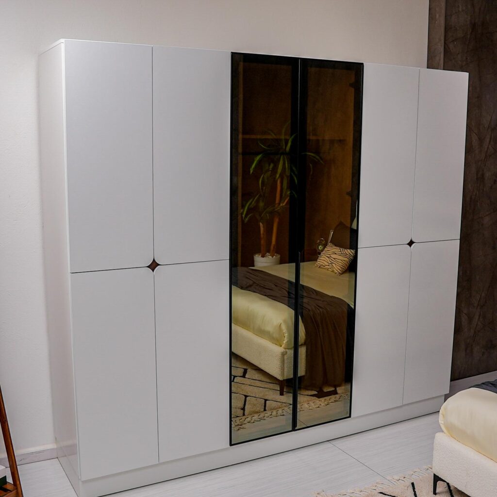 blanche épurée avec deux magnifiques portes en verre fumé. Ces vitres