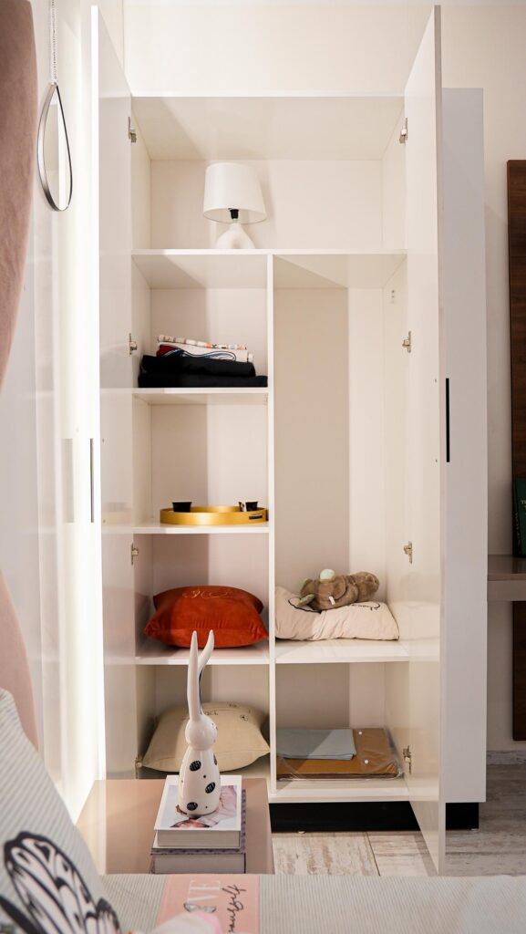 L’Armoire Luna : Un grand volume de rangement au fini blanc laqué, doté
