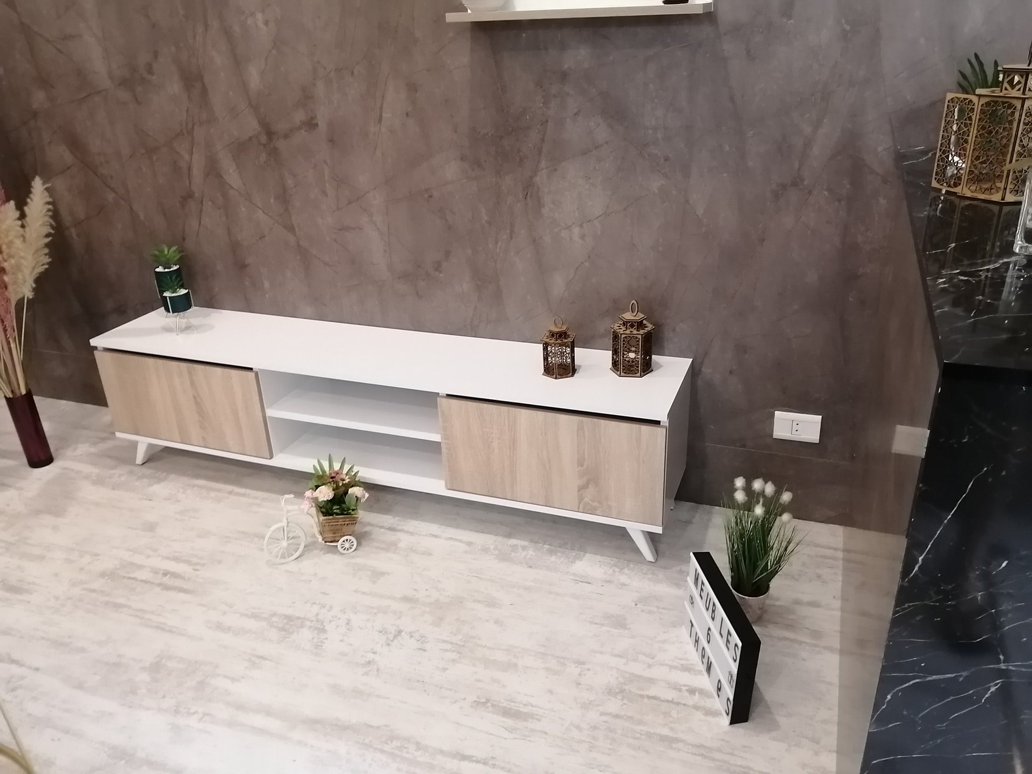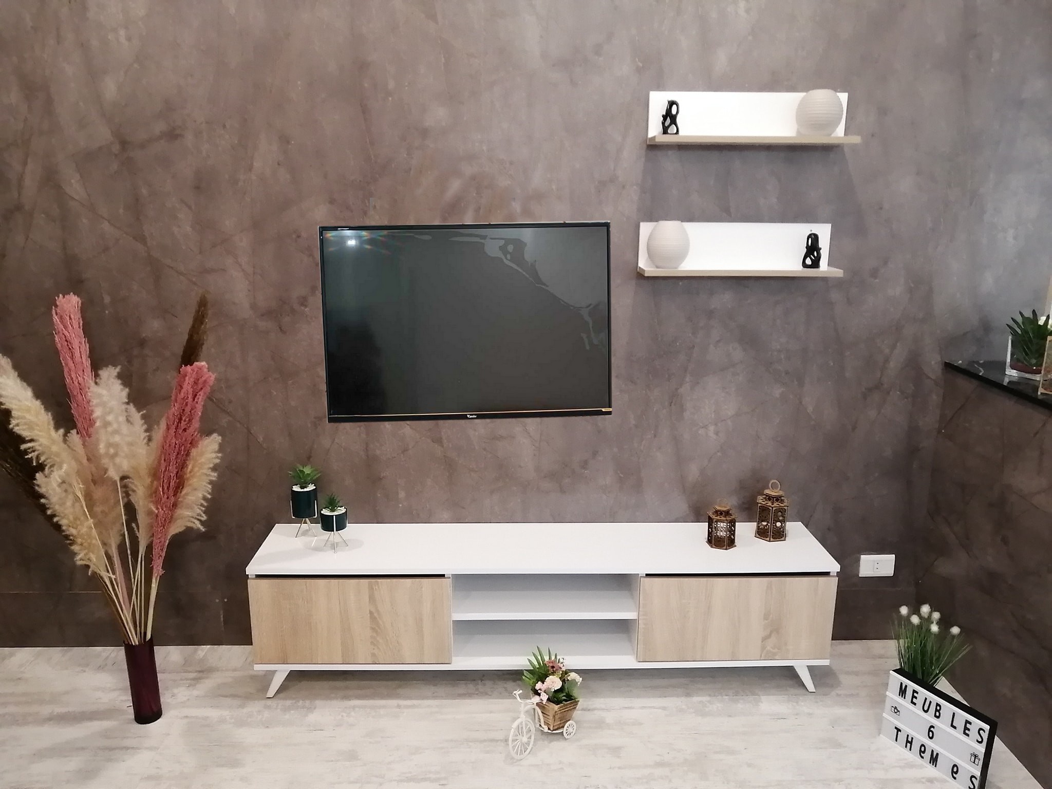 Apportez une touche de modernité à votre intérieur avec notre ensemble TV Living Art 10 ! Format : Longueur 1m80 (parfait pour les grands écrans). Style : Mix élégant de blanc mat et de bois naturel. Composition : Un meuble bas fonctionnel avec rangements + 2 étagères murales offertes. Le petit plus : Un design aérien grâce à ses pieds scandinaves qui facilite le nettoyage.