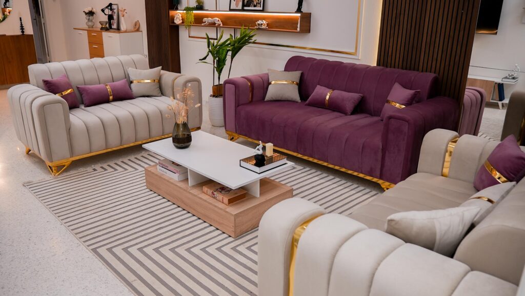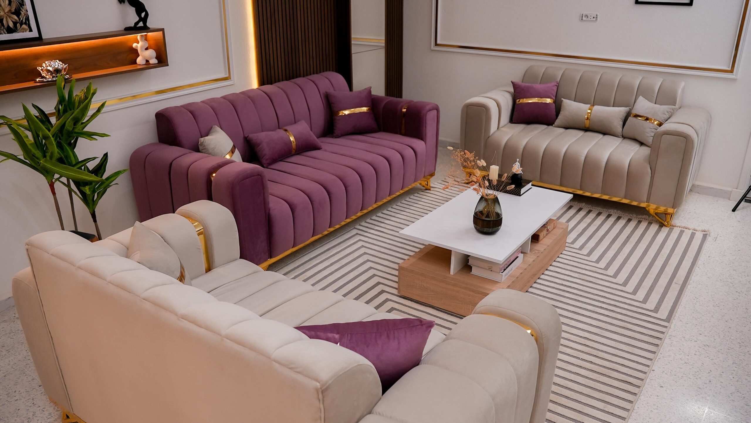 Sa disposition harmonieuse met en valeur trois canapés :