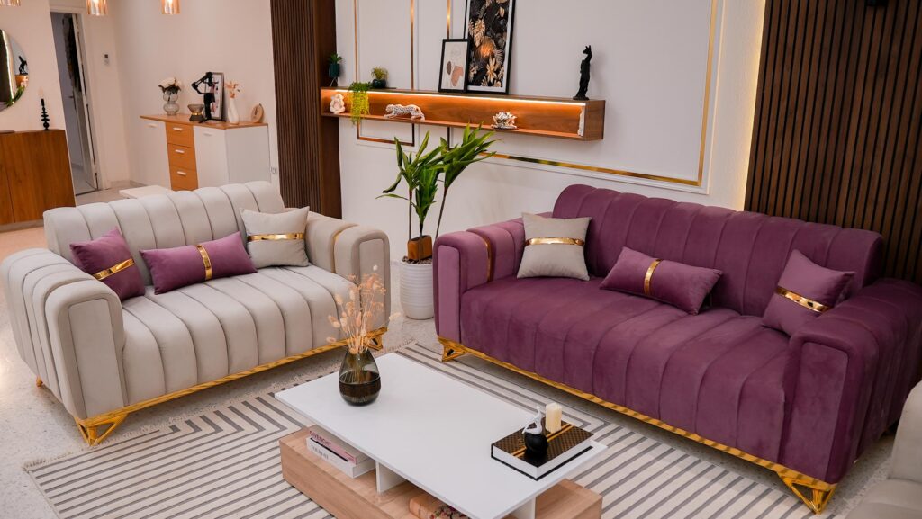 deux modèles 2 places disposés face à face, accompagnés d’un canapé 3 places