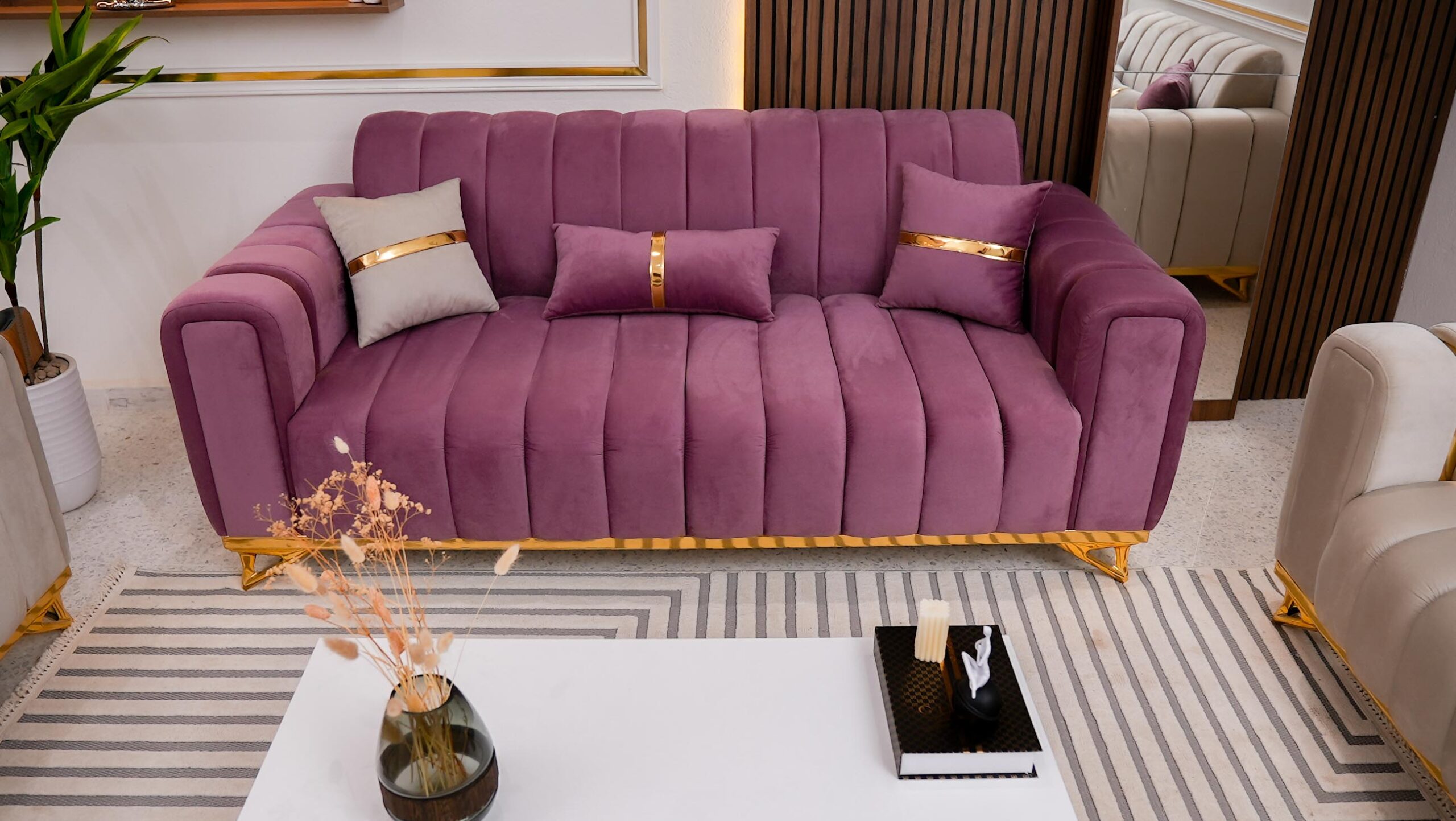 Les coussins, au design épuré avec une bande dorée, apportent une touche chic