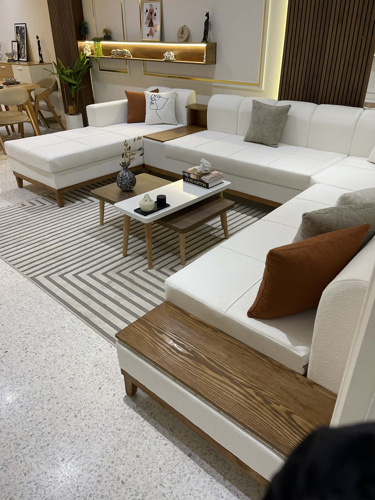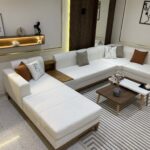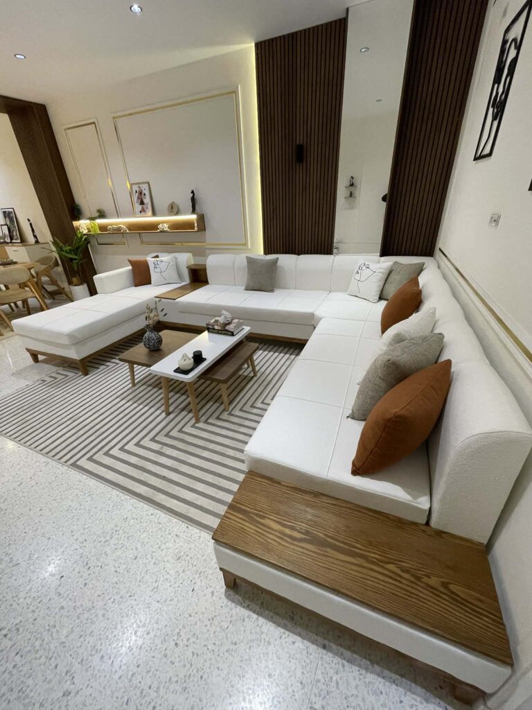Le Salon Zina est la pièce maîtresse idéale pour les grands intérieurs à la recherche d'un style épuré et contemporain. Sa configuration en U offre un espace de rassemblement exceptionnel tout en apportant une touche de chaleur naturelle. 📏 Dimensions XXL : Un format généreux de 1m90 * 3m80 * 2m90 pour une capacité d'accueil maximale. 🪵 Design Intelligent : Tablettes latérales intégrées et pieds en bois massif pour un look scandinave chic. 🌳 Qualité Noble : Carcasse robuste en bois rouge garantissant une stabilité à toute épreuve. ☁ Confort Premium : Assise haute performance en mousse 28/30 pour un maintien durable et moelleux. 🎨 Personnalisation : Disponible dans une large gamme de coloris et de tissus selon vos envies.