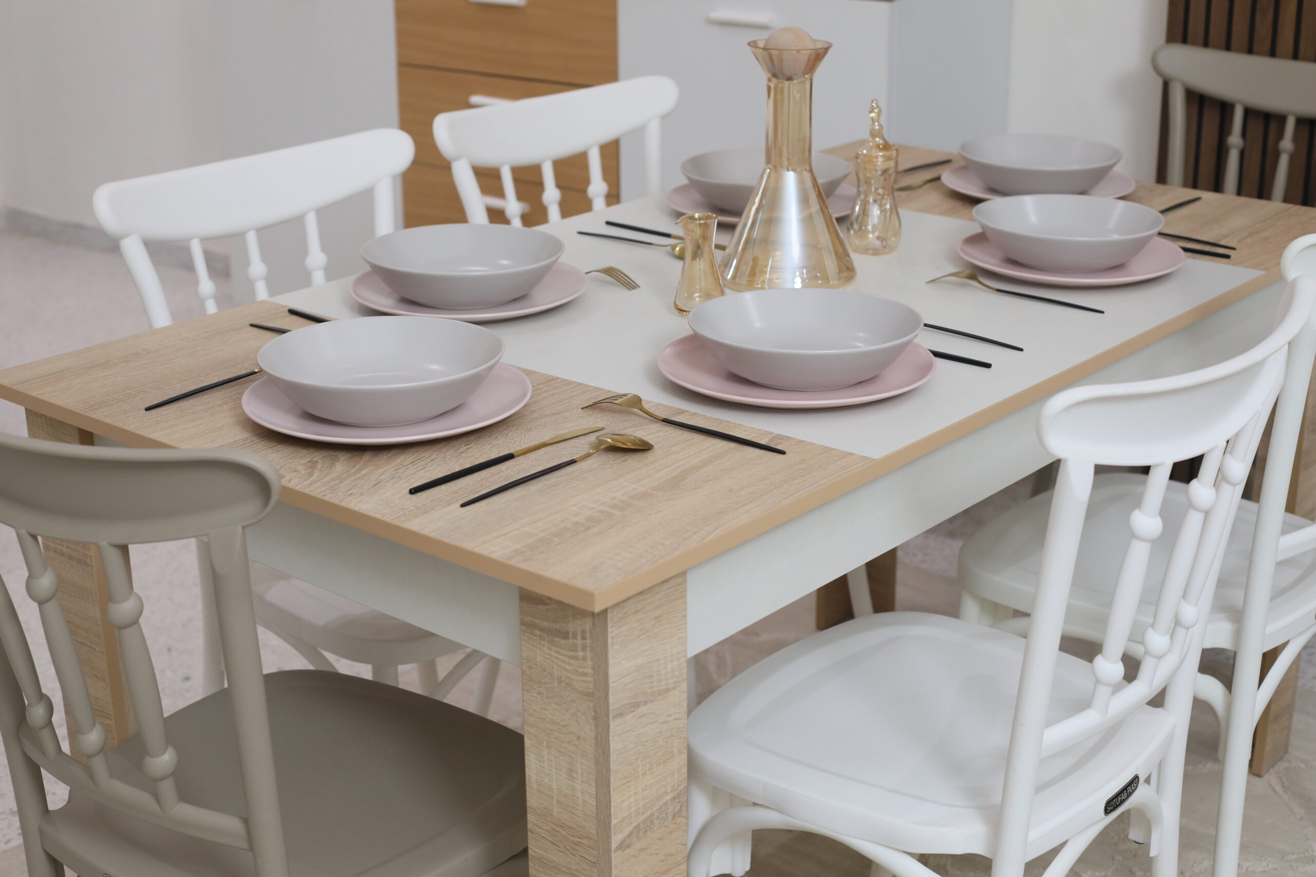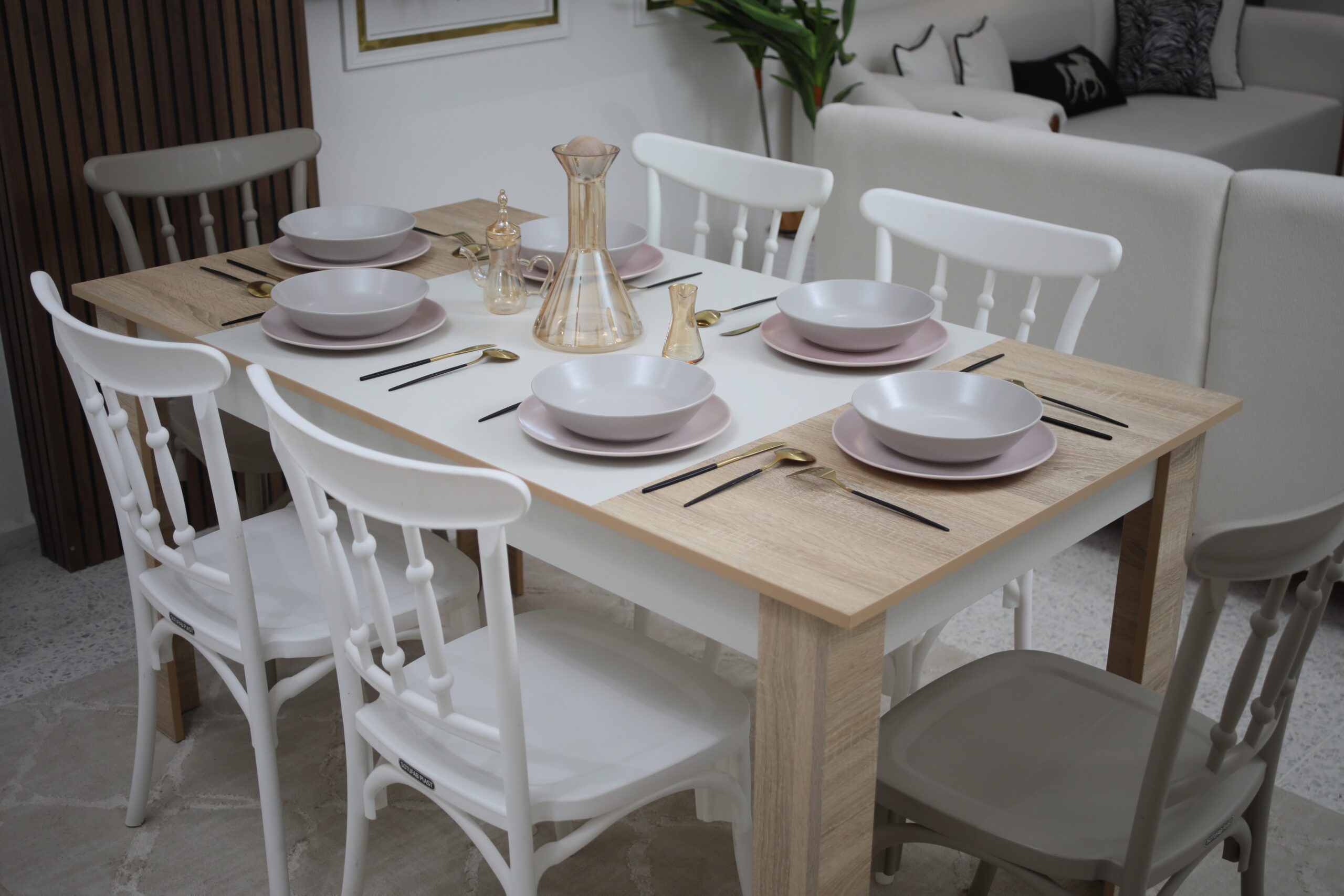 chaleureux avec un piétement blanc immaculé. Ce contraste crée un visuel