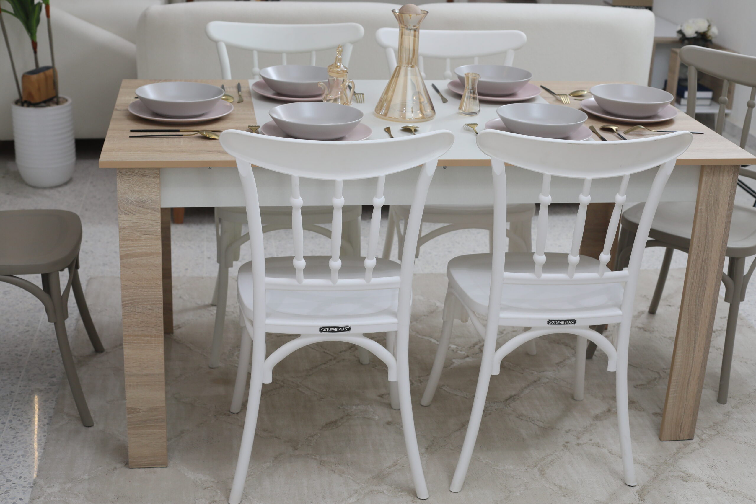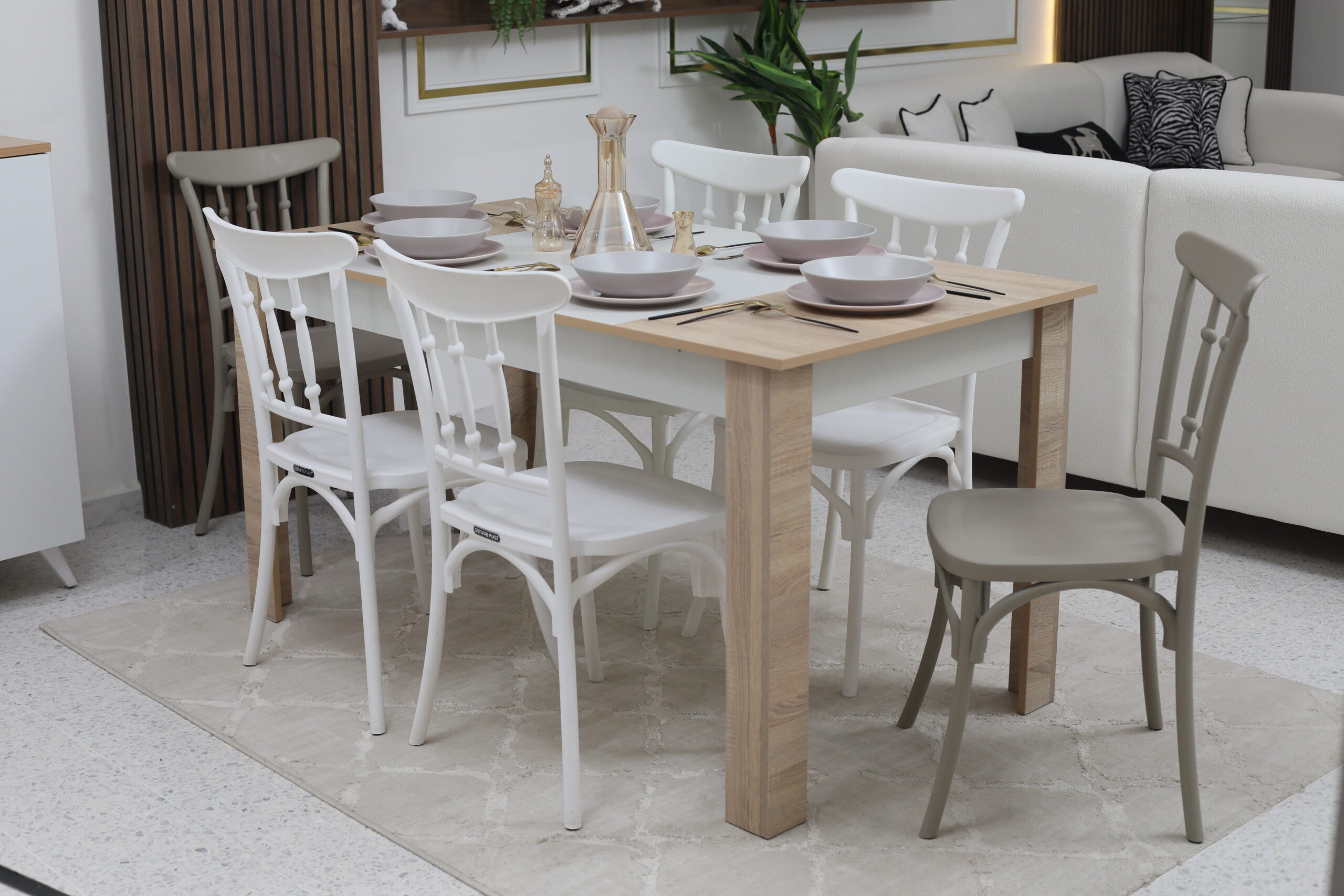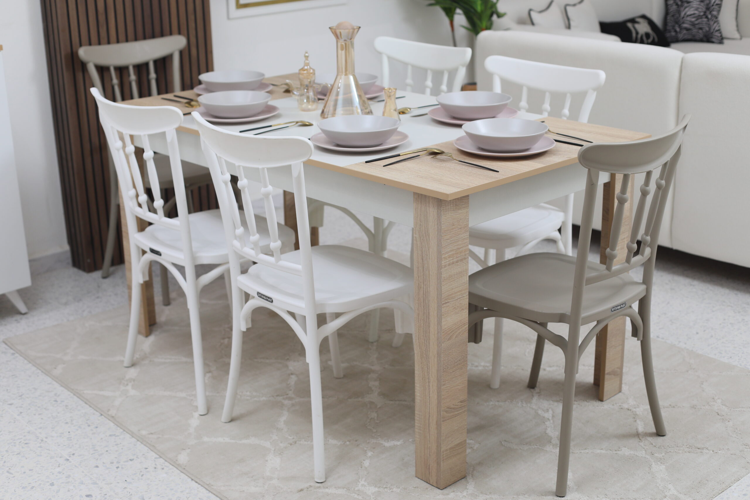 Jeu de Couleurs : L’ensemble se compose de chaises bicolores (blanc et