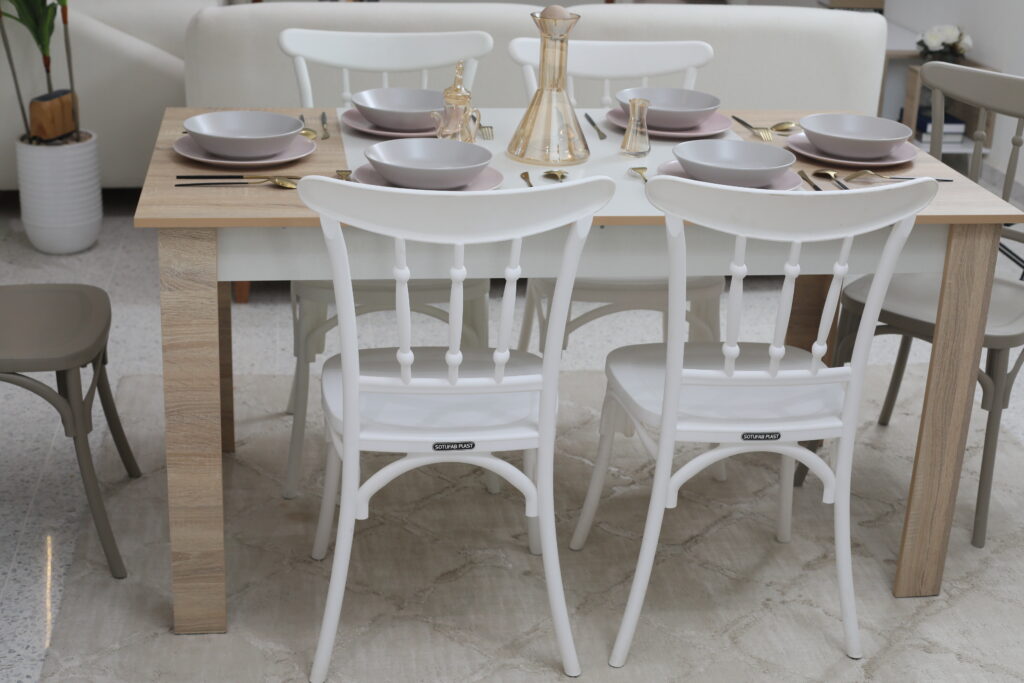 Matériaux : Plateau et structure de table en MDF / Chaises en plastique
